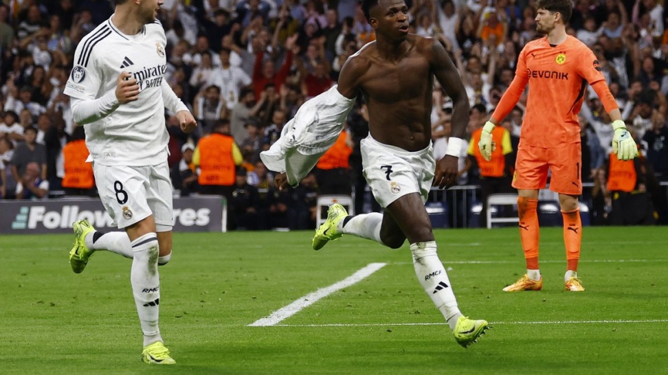 O atacante brasileiro Vinicius Júnior deu show, nesta terça-feira (22) no estádio Santiago Bernabéu, ao marcar três vezes na vitória de virada de 5 a 2 do Real Madrid (Espanha) sobre o Borussia Dortmund (Alemanha) pela primeira fase da Liga dos Campeões. Com este resultado, a equipe espanhola se recupera da derrota de 1 a 0 para o Lille (França) pela segunda…